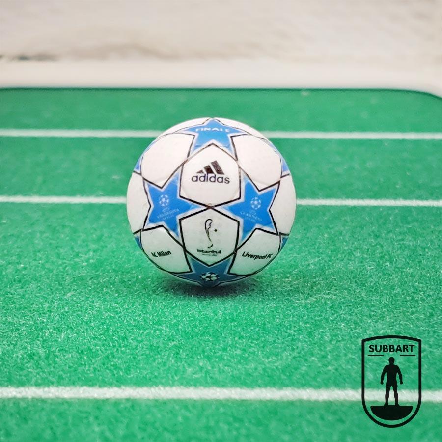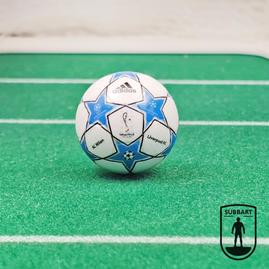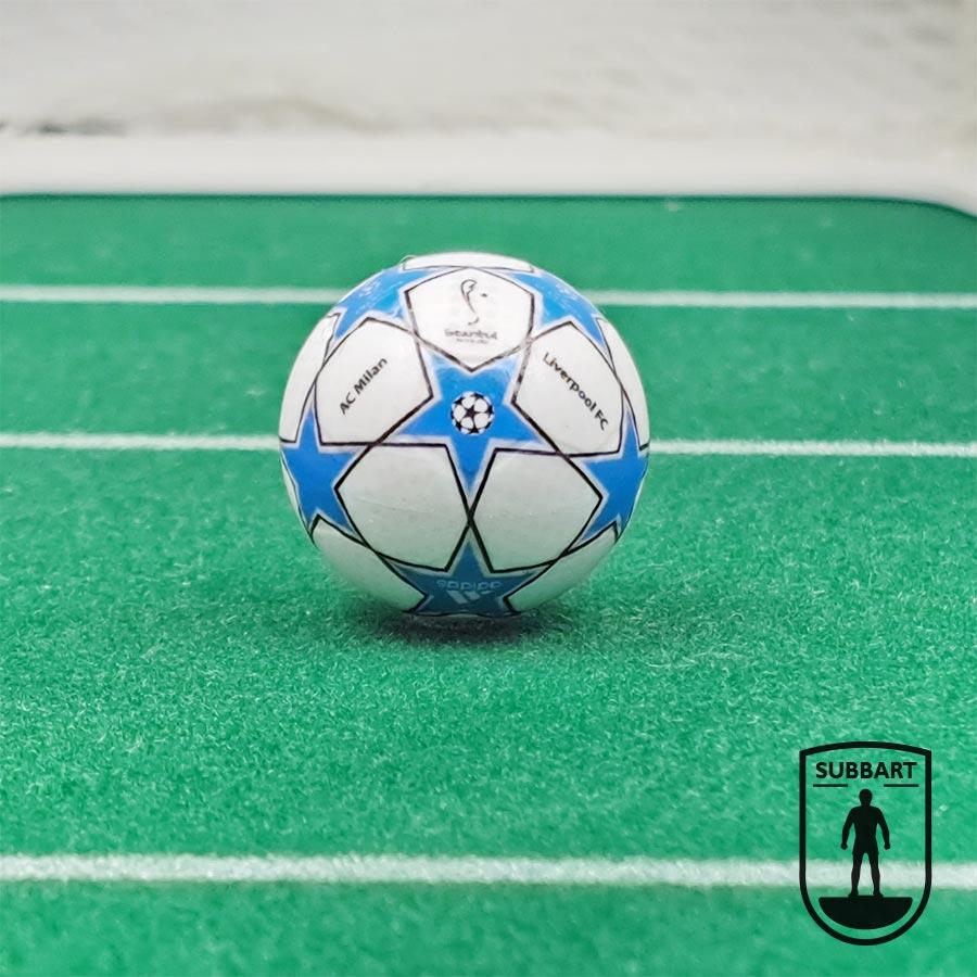 Questa pallina Subbuteo riproduce il design Adidas utilizzato in quella notte: stelle blu su fondo bianco, logo ufficiale e la scritta “Finale” che ha fatto da sfondo alla rimonta leggendaria del Liverpool.