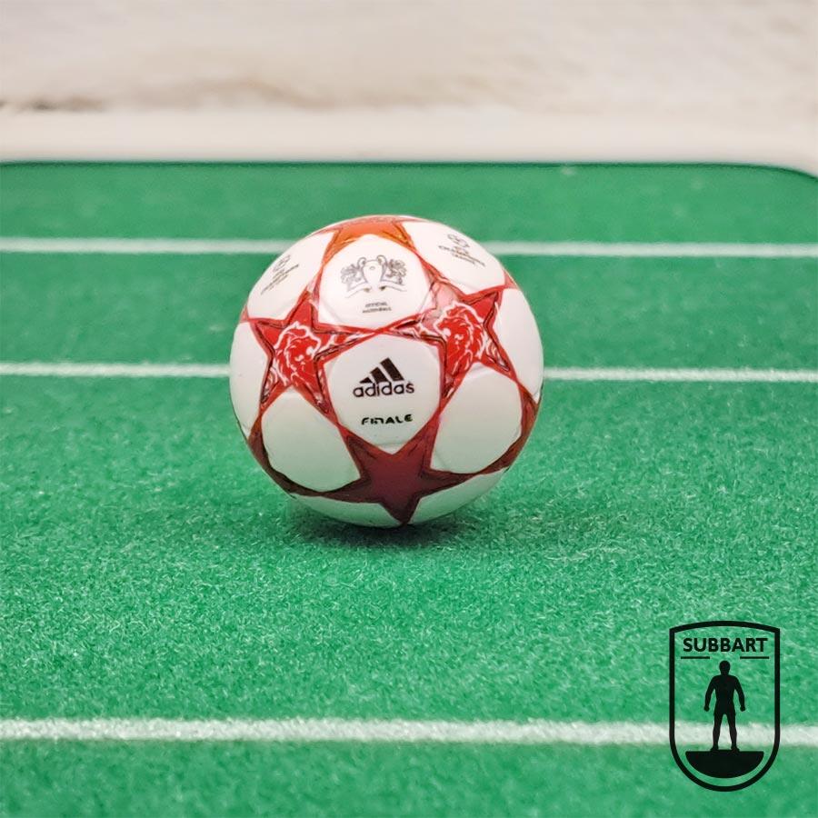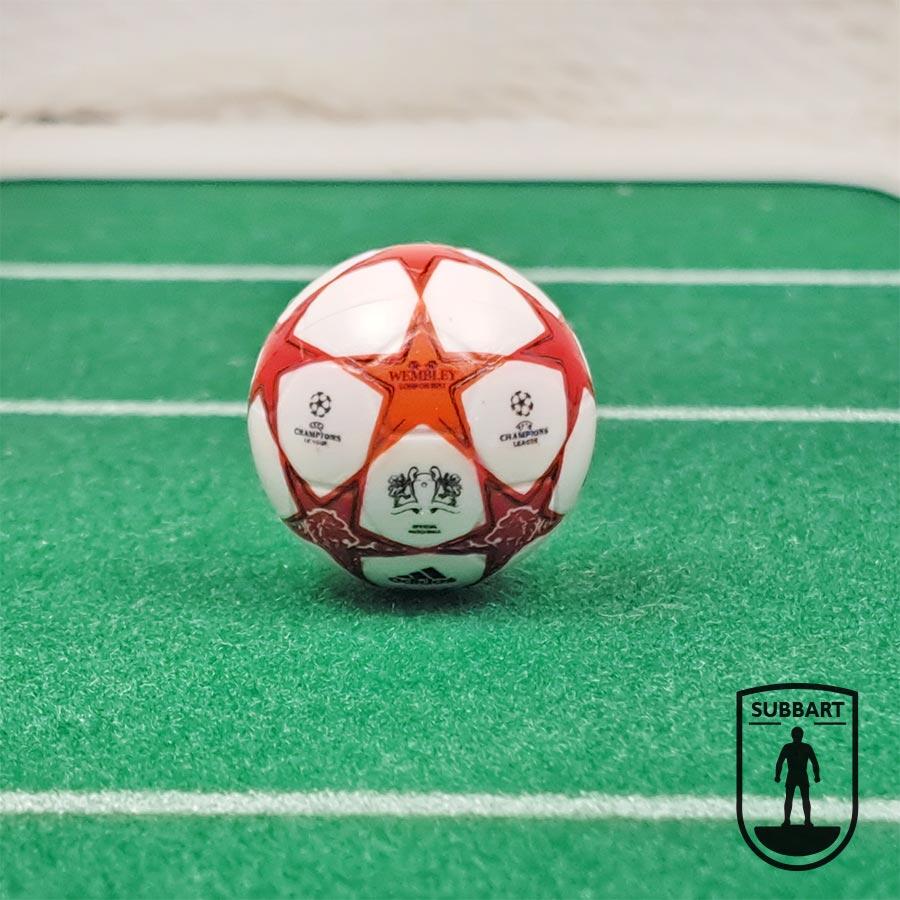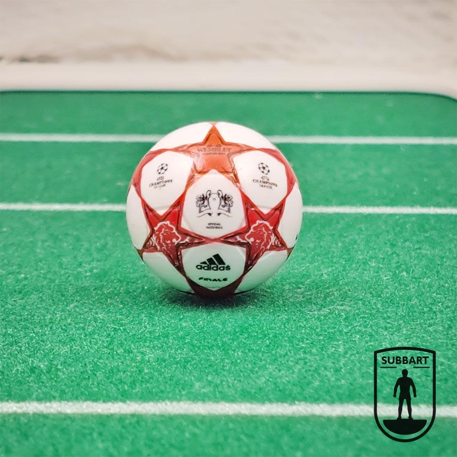Finale di Wembley, 2011: il Barcellona di Guardiola domina il Manchester United con calcio puro.Questa pallina Subbuteo riproduce il design Adidas utilizzato in quella notte storica: stelle rosse su fondo bianco, logo ufficiale e dettagli che richiamano l’eleganza della competizione.