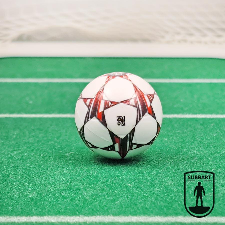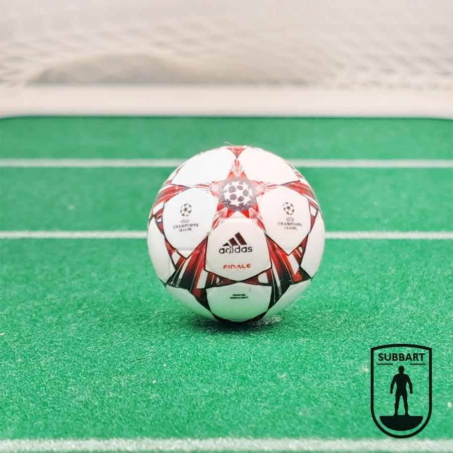 La pallina Subbuteo Champions League 2013/14. Il design, caratterizzato da toni rossi e argento, richiama la tensione e l’energia delle notti di Champions