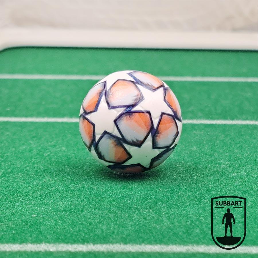 La pallina Champions League 2020/21 riproduce il design ufficiale Adidas usato durante tutta la stagione, prima della finale. Le stelle blu e arancioni su fondo bianco evocano l’energia e il ritmo delle notti europee, dai gironi agli ottavi. Un pezzo da collezione per chi ama il Subbuteo e vuole rivivere ogni fase della competizione. Perfetta per il campo da gioco o per arricchire la tua vetrina calcistica.