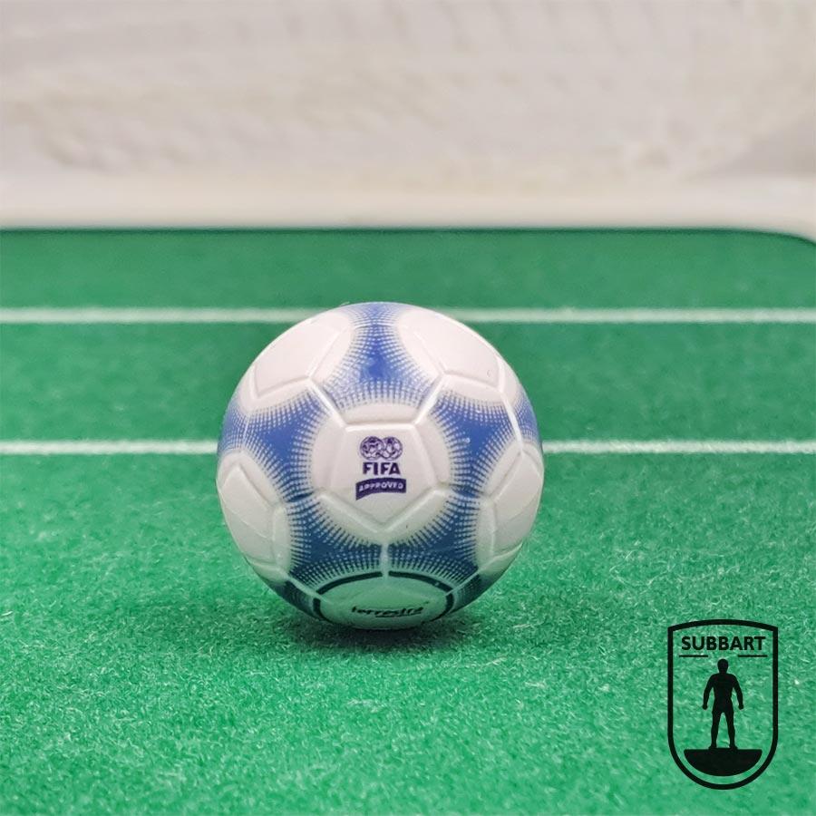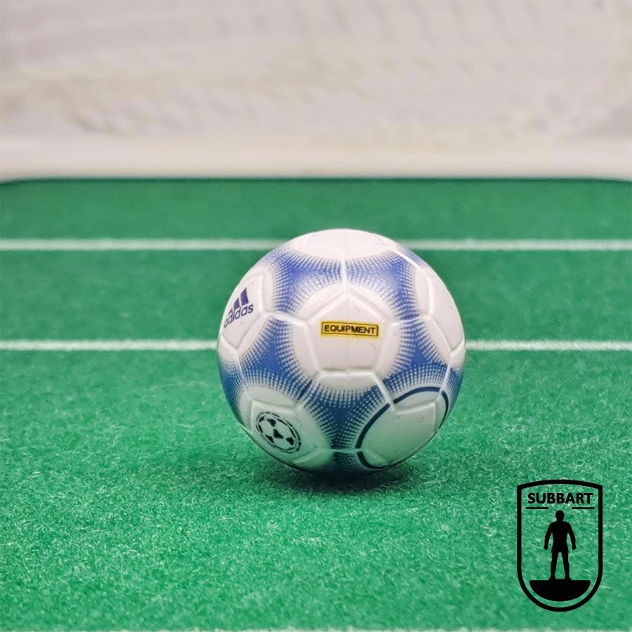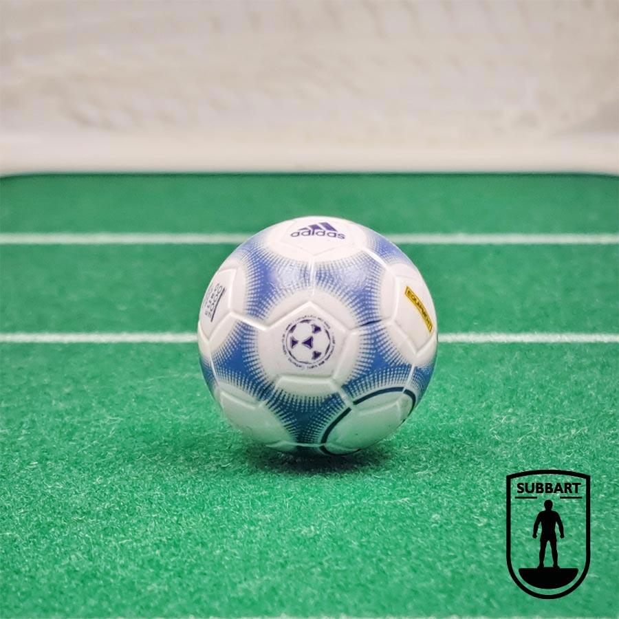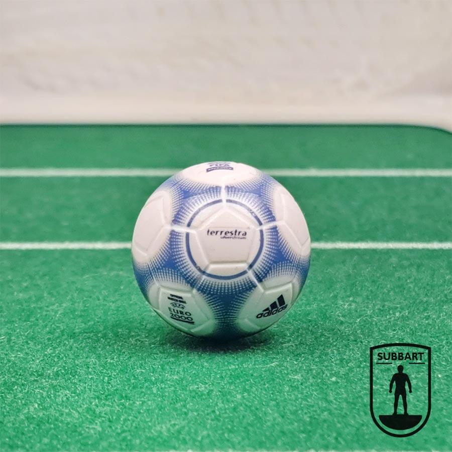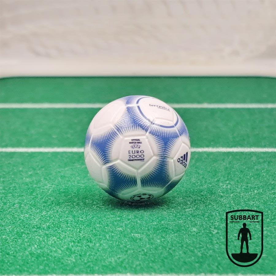 Questa versione Subbuteo riproduce fedelmente il modello originale: base bianca, curve blu, logo Adidas e marchio ufficiale Euro 2000.