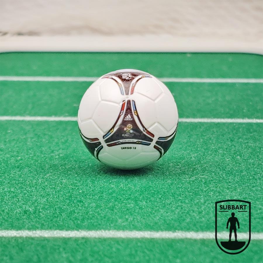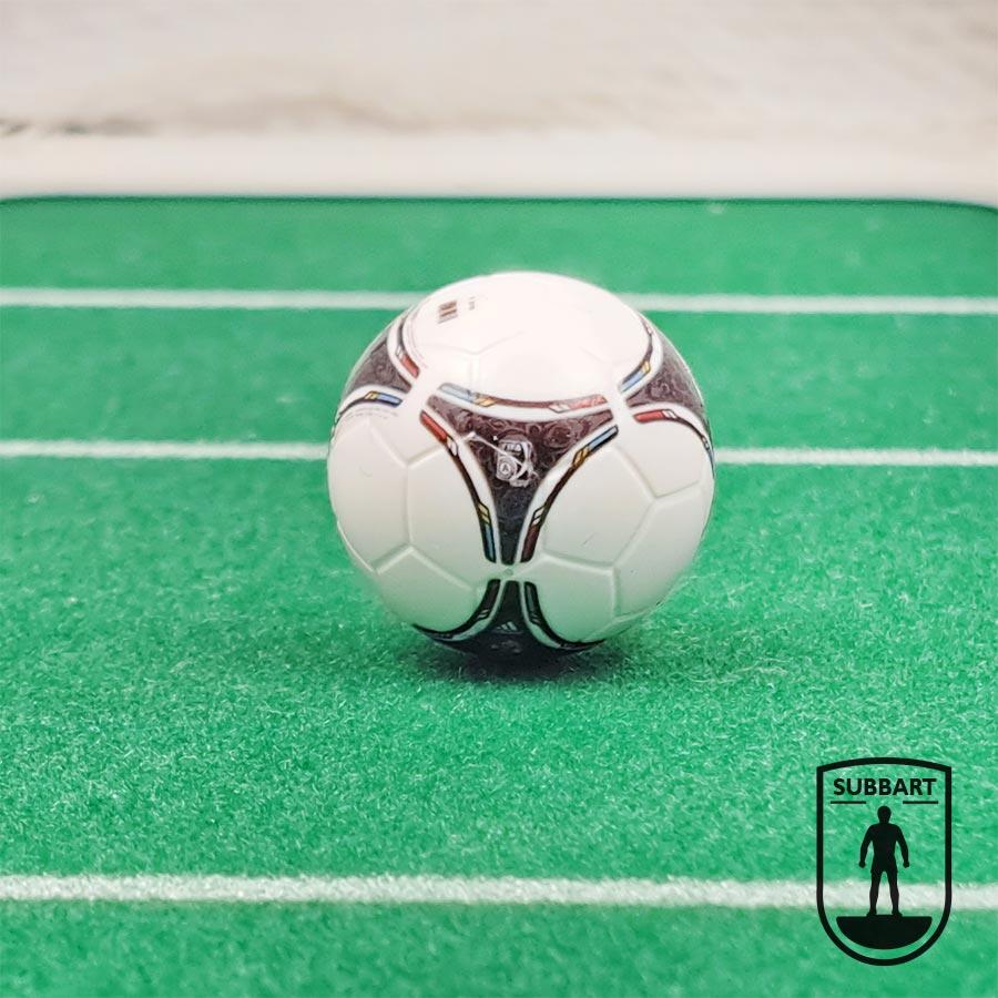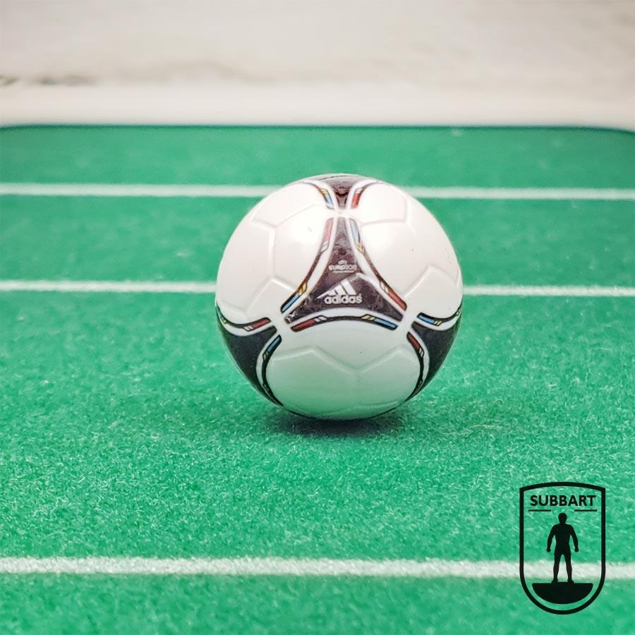 Questa versione Subbuteo riproduce fedelmente la pallina ufficiale: base bianca, disegni neri, logo UEFA e stile pulito.