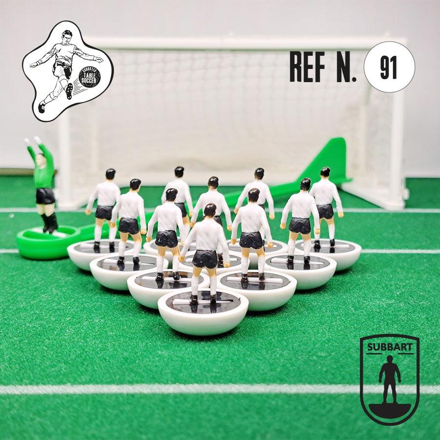 La Ref. 91 è una delle divise Subbuteo più iconiche e raffinate: maglia bianca con croce nera, pantaloncini neri e calzettoni bianchi. Una combinazione elegante e ricca di significato storico, che richiama squadre gloriose come il Parma.